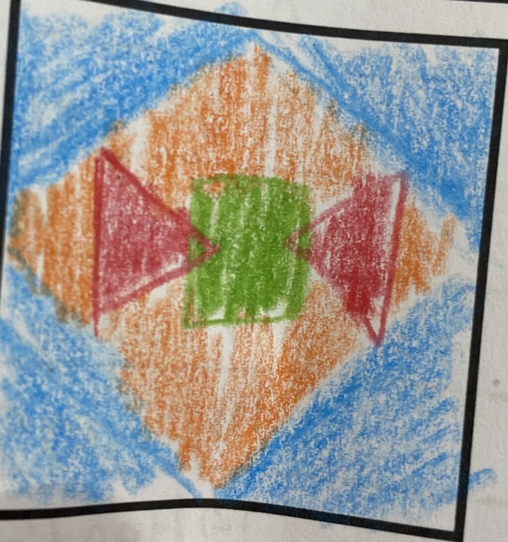 Some quotes I have from him explaining his reasoning behind what he liked. This was his explanation on why he chose a blue background. “I like the water, the sky looks pretty”(Hyde) his explanation on his choice for the triangles that represented dragon wings are “I re watched how to train your dragon and wanted to include it.”(Hyde) the rhombus he had was a sort of gate or portal for the dragon itself to come out from. “to make the dragon come out of the book”(Hyde). while at first I thought it made no sense.