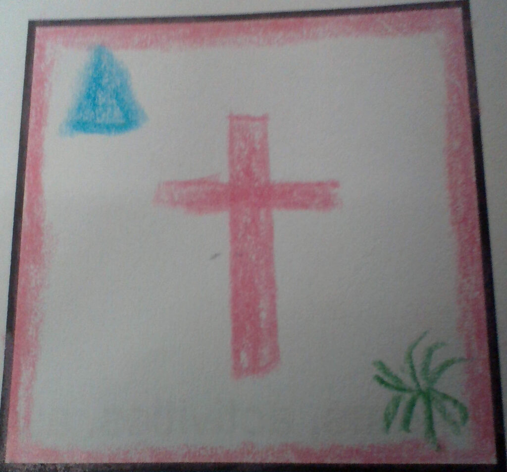 When asking Kminich about why she choose to include these things she explained them clearly and made them very understandable. The first thing I asked her was what did the pink cross I asked what does it mean and why did you include it she answered “because I’m Christian” this is pretty much what I expected as a answer because the cross Is a symbol of Christianity. Moving on to her next symbol I asked her what does the pink border mean to you she said ” Pinky promise” I then asked her why did you choose it she answered ” because I’m a trust worthy person” my reaction to this answer was a little surprised because I would have never thought using the pink color would be crossed with being a trust worthy person. The blue triangle I asked her the same question she responded with ” ocean ” and ” camping” when I asked her why she said ” Because I like the ocean ” and ” Because I like to go camping”. The green bush I asked her what it was and what it meant she responded with ” pompom” and ” Because green is science and I love it”.