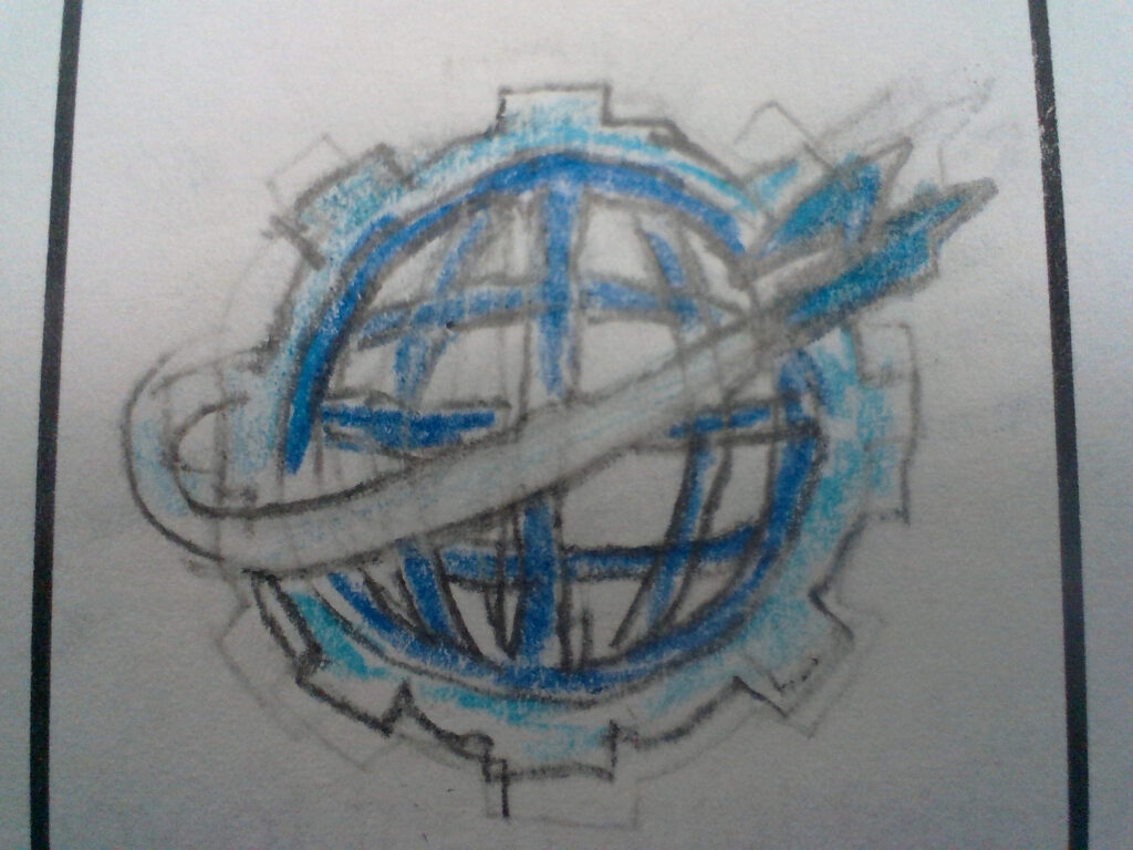 At first I guessed that the globe symbolized his liking for traveling or to do with the history of the world. I also thought the cog represented his ingenuity or creativeness. I thought the swish in the middle was a Nike symbol going around the globe.