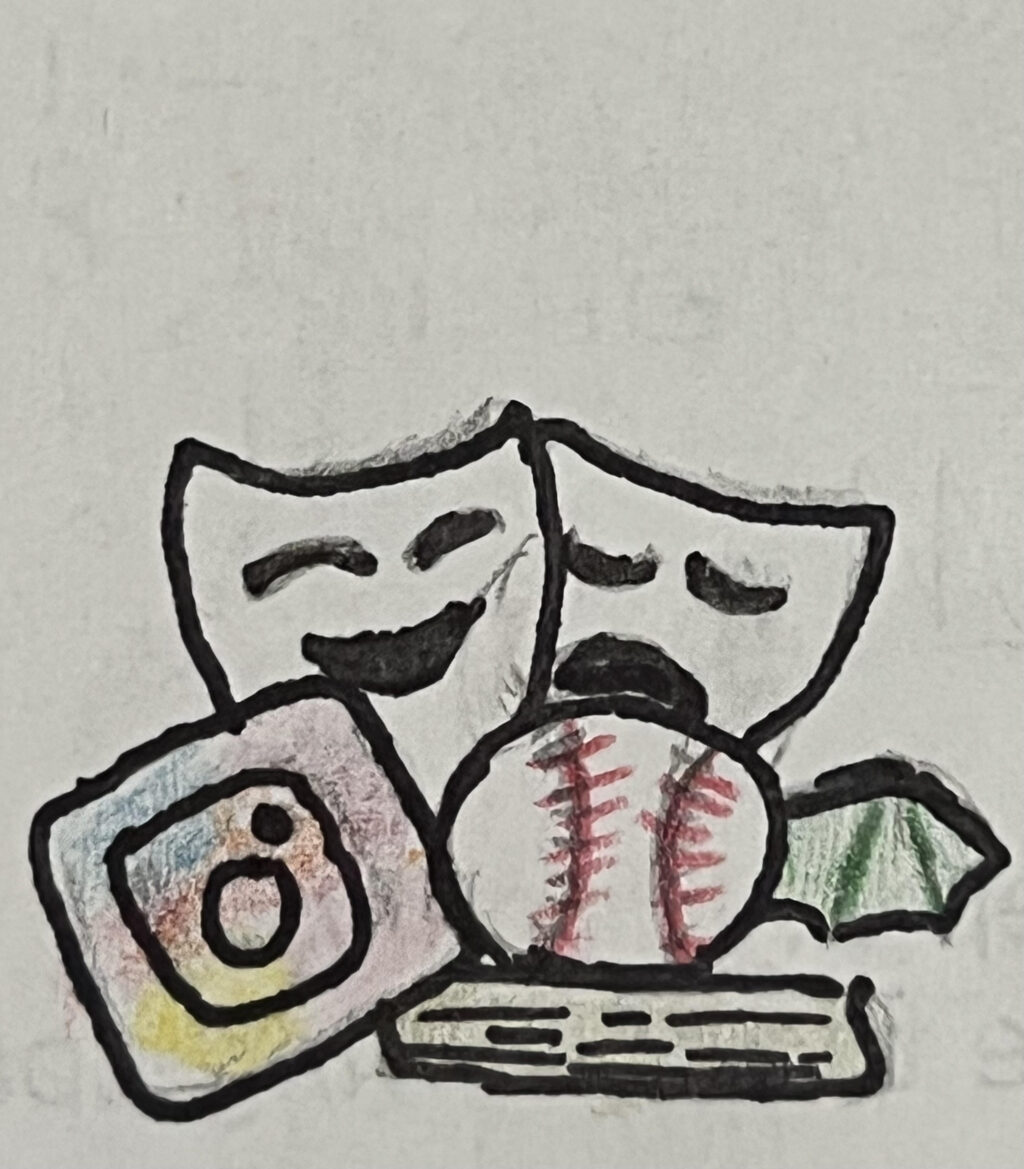 Describing it without showing it I would say is, imagine a colorful scene where the masks might represent different classes or emotions, this shows the broad spectrum that is Asmith26 emotions, this shows her fun adventurous side and also tells about her anxious side. There is so much to learn about her and about her perspective on life. There are baseball with wings symbolize passion for watching sports with her family, while the book tells about her love for stories, and “reading to escape reality”.