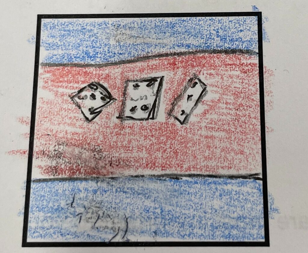 Mine I just did because I like music/spotify and I like the color purple. My partner’s drawing is a box with blue at the top and blue at the bottom then there’s a red box with 3 dice in the middle.